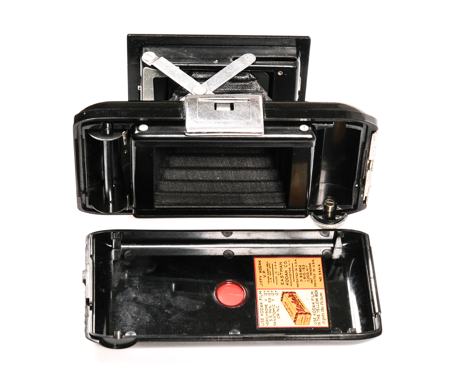 This folding camera was made by Kodak Eastman (made of bakelite) during the Art Deco period, around the middle of the 1930s. It folded up neatly into a compact little article that was extremely portable, and for that reason came known as a ‘vest pocket’ camera. Apparently a favourite with soldiers during the 2nd World War, easily carried and quickly made ready for action, hence the name ‘Jiffy.’
