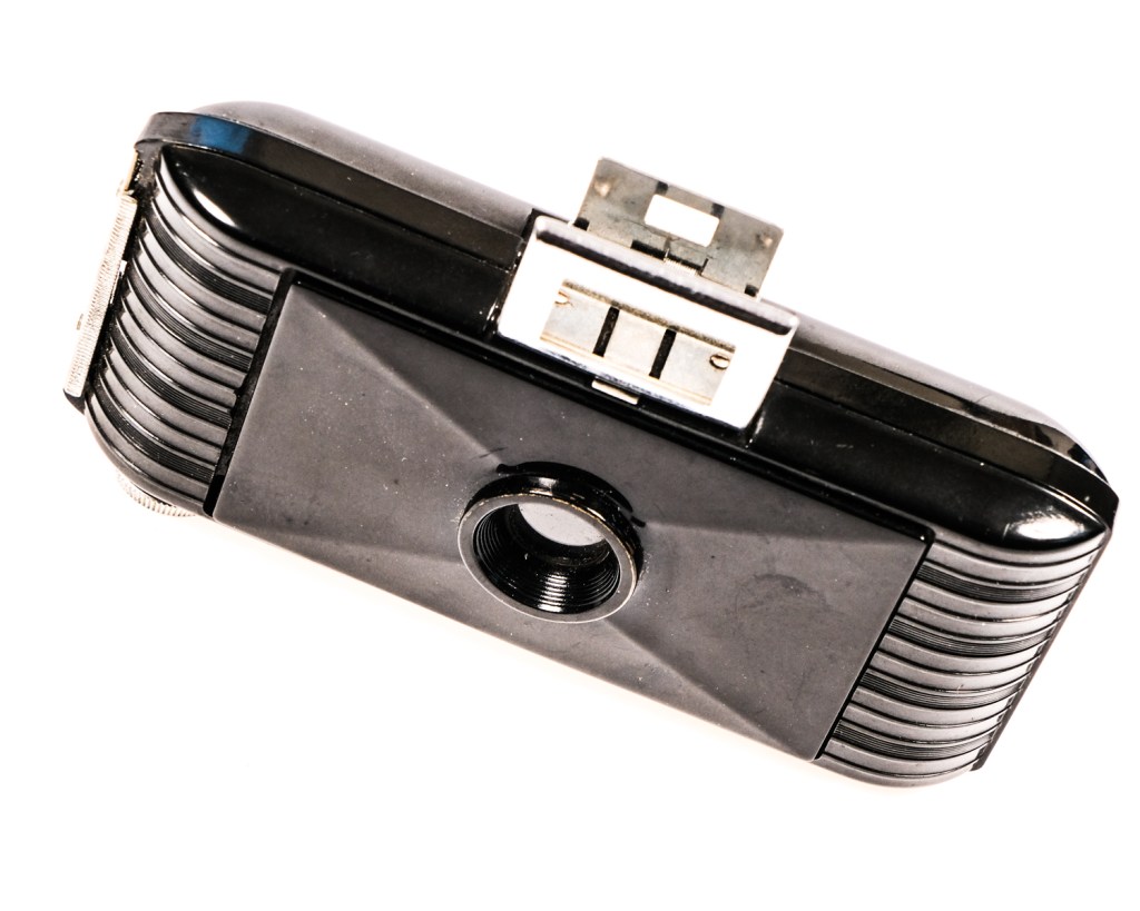 This is the VR camera. It has a pop-up viewfinder on the opposite side to the winder lever, – which, essentially means that the viewfinder is on the BOTTOM of the camera! The lens folds out from the body on a scissors mechanism. The shutter speed is 1/50th sec, and there are two aperture options, f/11 and f/16. The lens has a focal length of 70mm, and focussing is fixed with a range of 10ft to infinity.