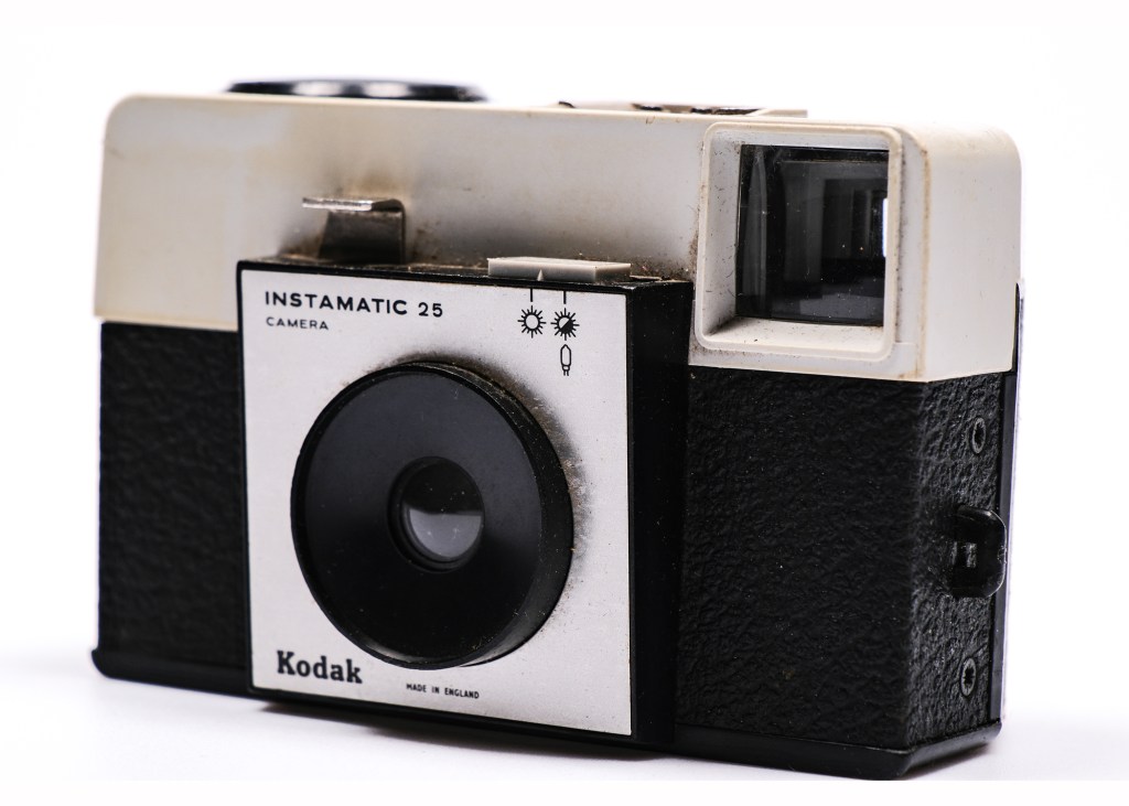 The Kodak Instamatic film camera was introduced in 1966, in England and Spain and remained in production until 1972. The essence of simplicity, this camera was made for photographers who knew nothing about photography. It was ‘instant and automatic, – instamatic’ in that all you had to do was lift it, point it and shoot. It had just two settings; two shutter speeds, 1/90th second and 1/40th second, selected by a lever above the lens, shown as a sun symbol and and half-sun symbol respectively. The camera had a fixed lens with a fixed aperture. There was a hotshot for flash bulbs.