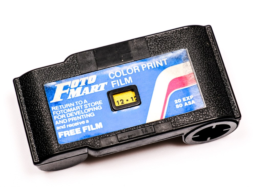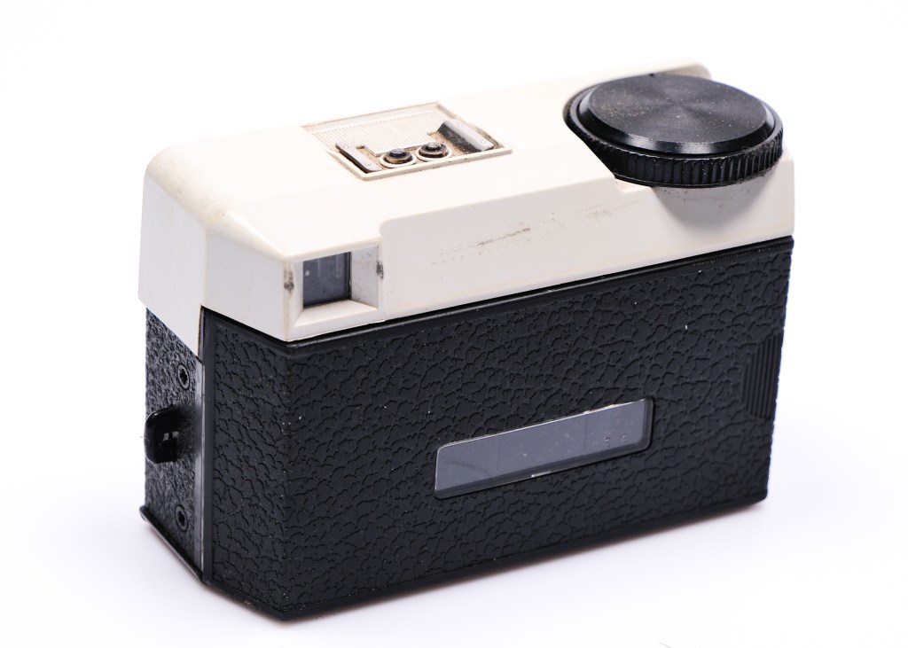 Film was the rigid cassette style 126 roll, made similar to the 110 format cassette. Again it was made for simplicity, – the cassette just slipped easily into the camera. The cassette had a small window at the back, corresponding with a similar window on the back of the camera, so that the photographer could see the number of frames used. The film, made by Kodak, in 12 and 20 exposure options, up until 1999, did not need to be rewound, – just extracted from the camera and sent off to a lab for processing.