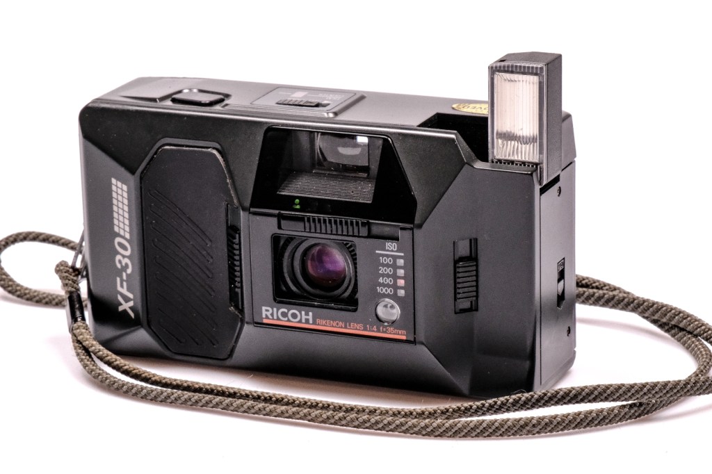 Another example from my weird collection of cameras and photographic bits and pieces gathered up from friends, relatives and charity shops. This little film compact camera is the Ricoh XF-30. Mine is black – but I’ve seen a few nice red examples on the second hand market.