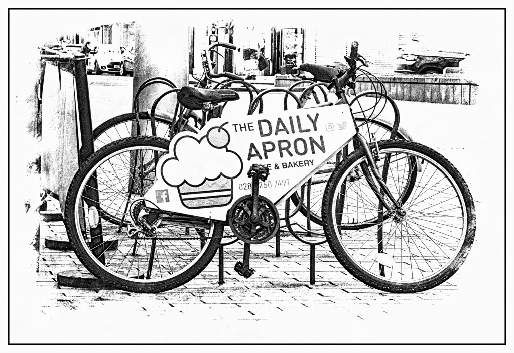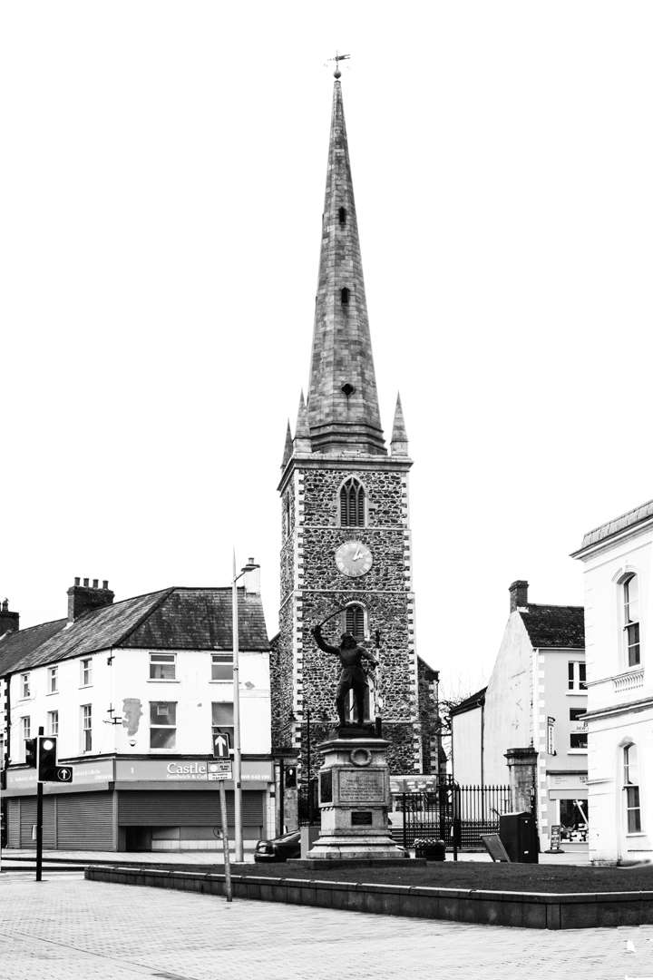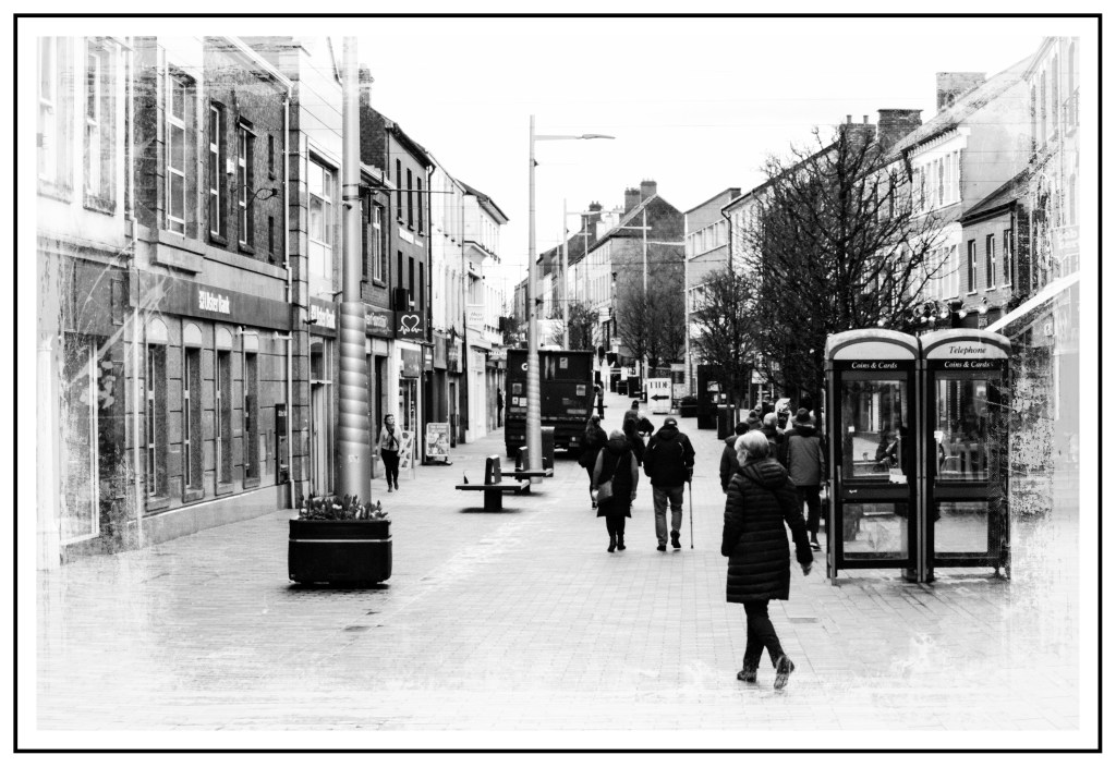 So, there was me, taking a stroll through the beautiful city centre of Lisburn (there’s a joke – boarded up shops and empty buildings – the place looks decrepit, a shadow of its former self). I got up to Castle Street, where once stood the Co-Op supermarket, and the big NIE electricity showroom, and Frederick Thomas Prams and Nursery Goods, and I noticed that amid the dereliction, there were ridiculous balls of some sort strung across the street. I decided to make an image – this is it – mediocre enough, like Lisburn itself.