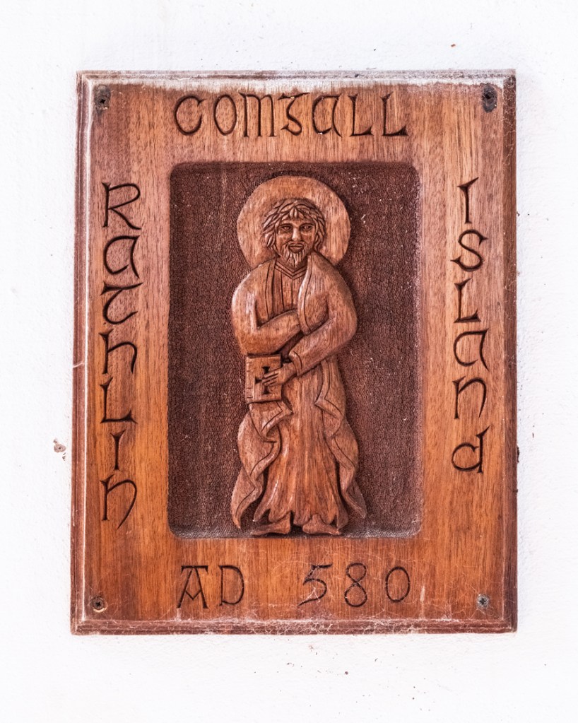I’m not fit enough to walk down the cliff steps to view the puffins, so we confined our exploration of Rathlin to the village itself, and to the one main road that runs across the island. (Bicycles are available for hire, but we stayed on foot). There are two churches, Roman Catholic and Anglican (Church of Ireland) and these were both open for visitors and photographs. Getting to the RC Church was a bit of a climb, for the road on Rathlin rises quite steeply from the village, but it really is worth the effort, for the views across Church Bay are stunning.
