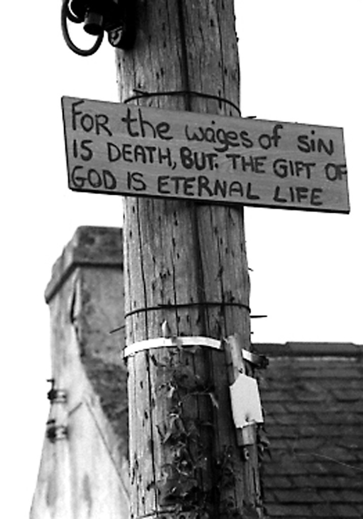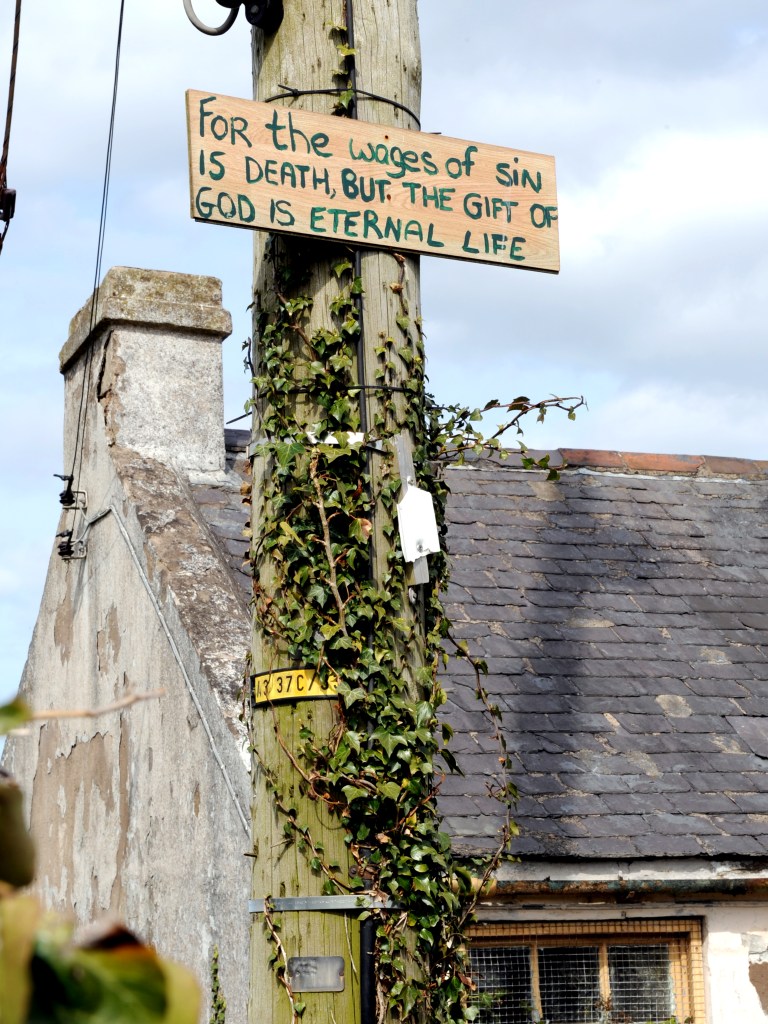 - I love the overgrowth of ivy and the grain of the old post and the uneven, amateurish writing on the sign itself. This sign is totally evocative of working class Ulster Evangelicalism, with its fervour and yet its complete lack of sophistication – that same unsophistication that infuriates more liberal elements, who refer to it using such pejorative terms as ‘Bible Bashing’ or ‘Redneck.’ Yet the people who would have attended this hall would have been honest, hard-working, God-fearing farmers and workers, whose creed would have taught them to hate sin, and to love sinners, the very message of this sign.