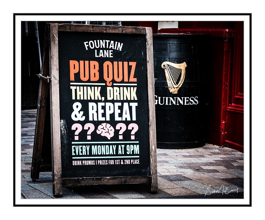 Pub quiz sign in Fountain Lane, Belfast, photographed with the Fujifilm X-T50 camera.