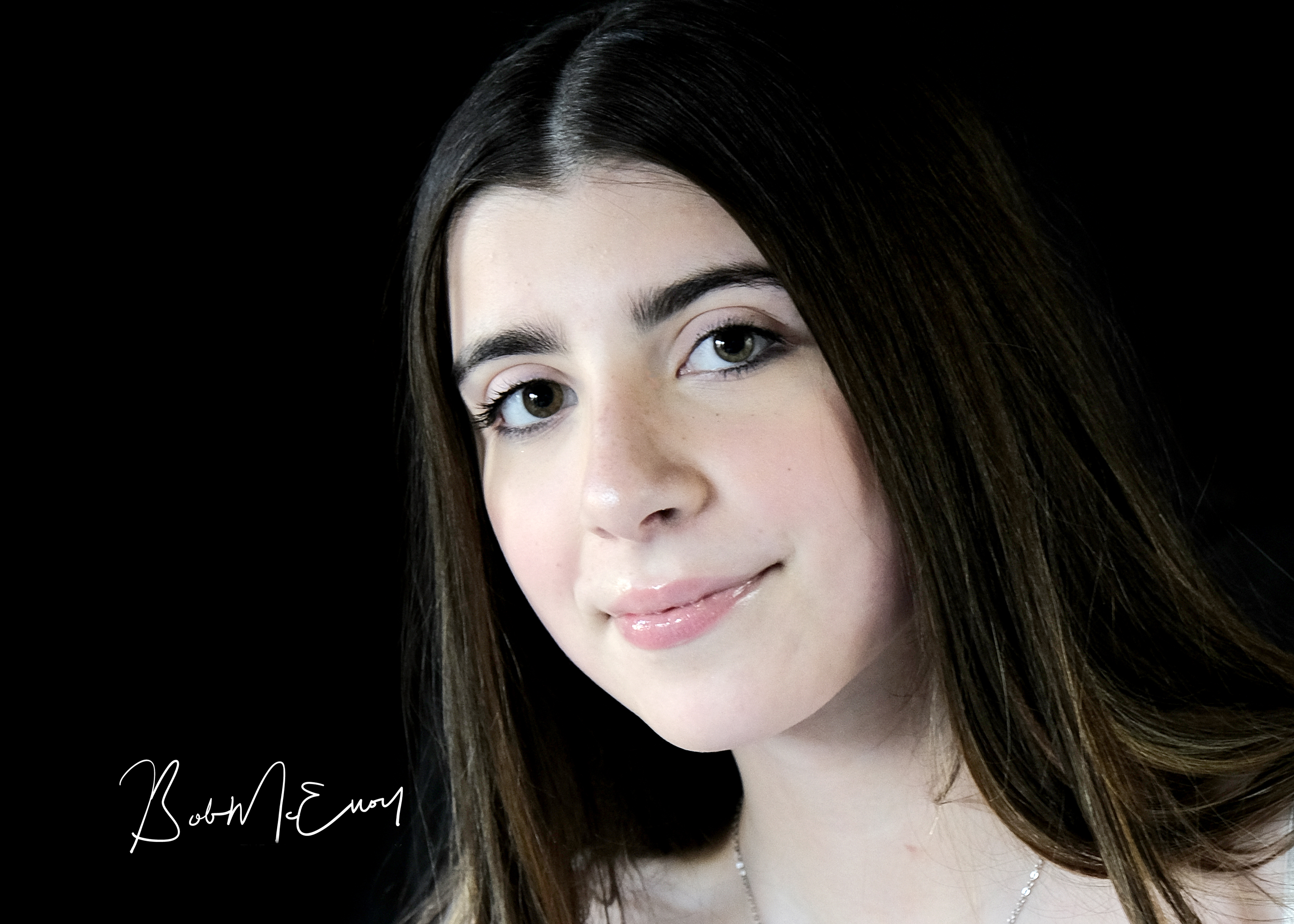Here’s Angeline, photographed with the Fujifilm X-T3, against a plain black backdrop, and with only natural light, coming through a narrow window. I balanced the light with a silver reflector on the opposite side of her face.