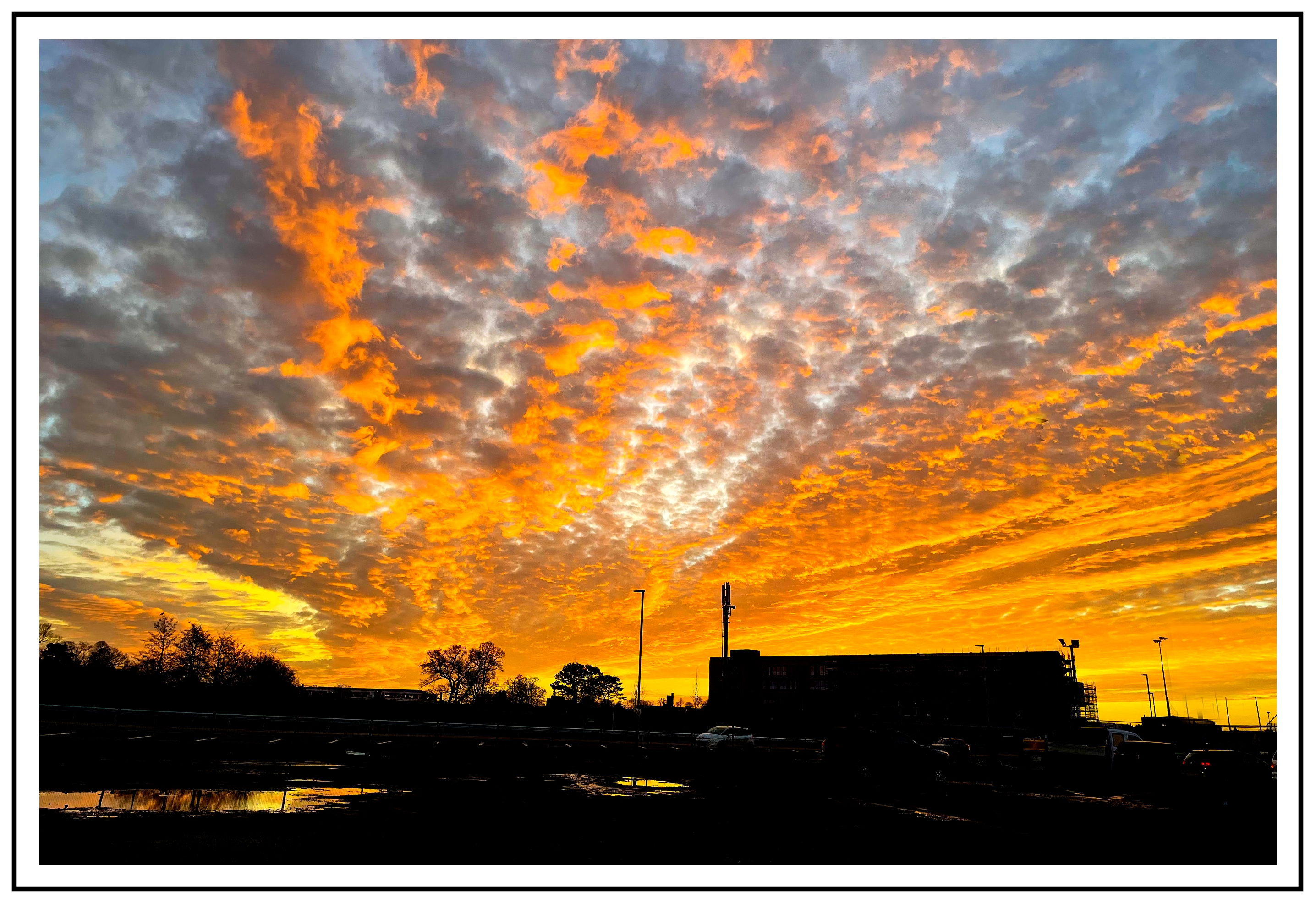 Ballymena, the ‘Middle Town’ in Co.Antrim, is known for its shopping streets and its churches, and its friendly people… But tropical sunsets, – in January? Yet here’s the sight that caught my eye as I turned the car into Ballymena Showgrounds car-park on Monday 29th January 2024…